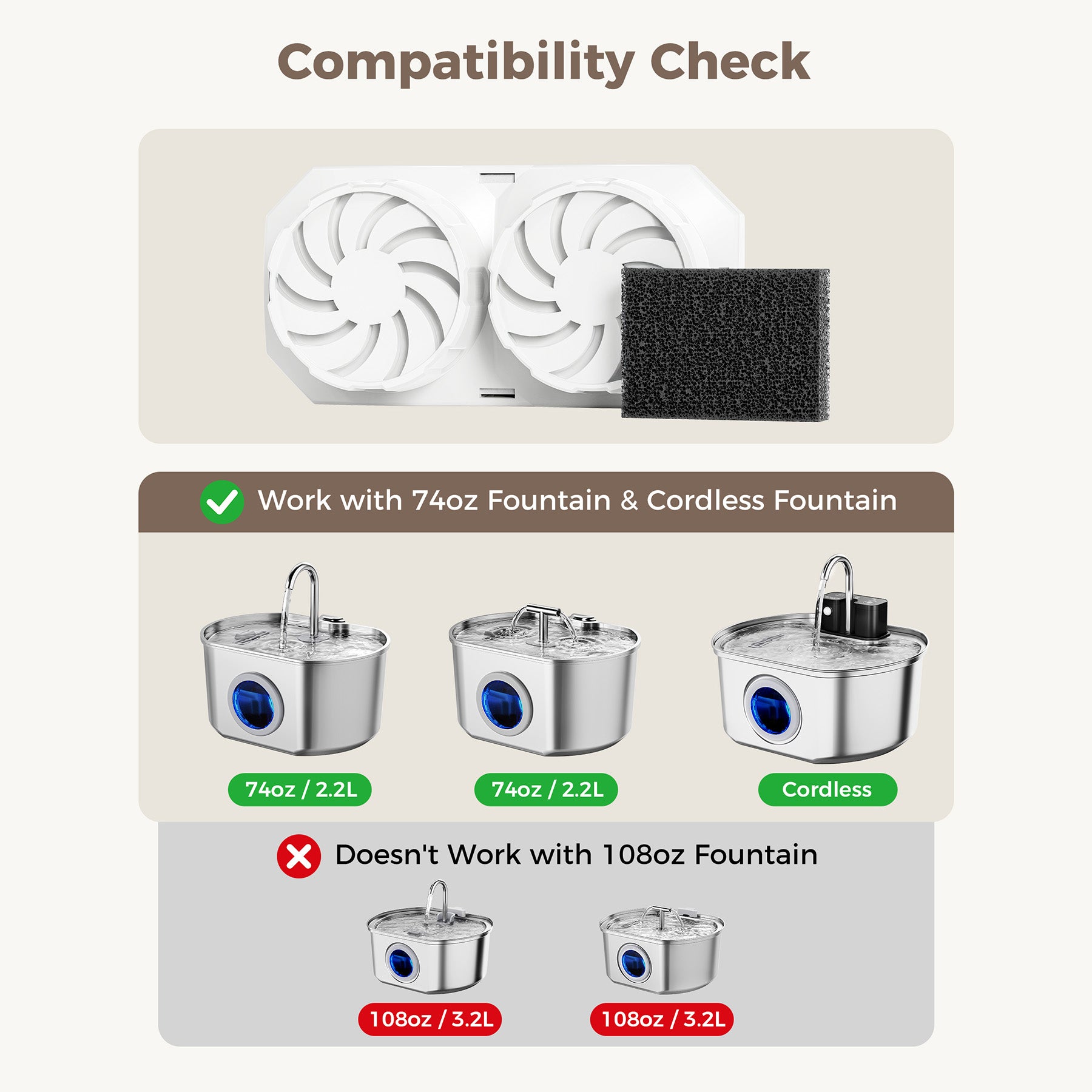 Perfect Match: Compatible with 2.2L/74oz Stainless Steel Cat Water Fountain